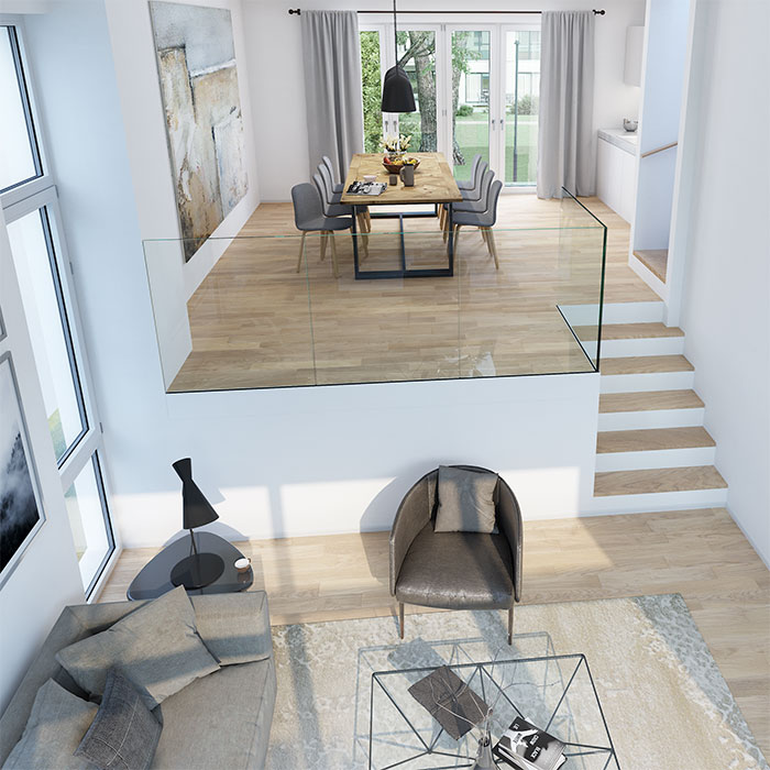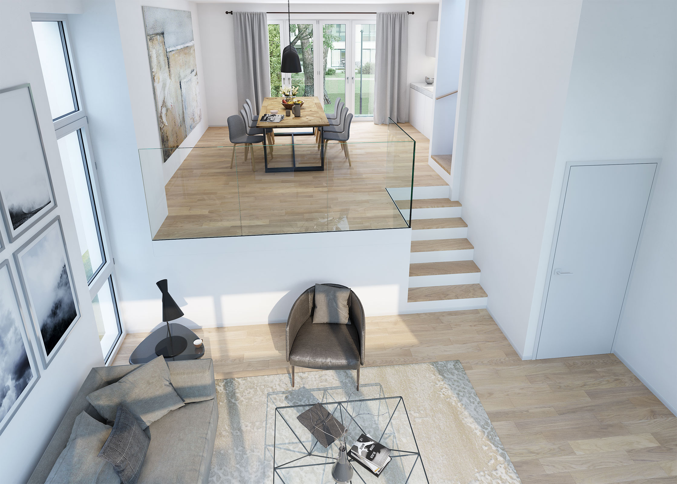 Ein normales Reihenhaus ist unser Lofthaus nicht. Das Besondere hier ist der großzügige Wohn-/Koch-/Essbereich mit über 35 m² groß auf versetzten Wohnebenen. Der Wohnbereich verfügt dabei über eine Raumhöhe von bis zu 3,64 Metern. Natürlich ist das Haus nach Südwesten ausgerichtet, eine großzügige Terrasse führt in den privaten Garten. Optional ist sogar ein Dachgarten möglich. Bis zu sechs Zimmer auf ca. 135 m² Wohnfläche, ein Badezimmer, ein Gäste-WC und ein eigener Hauswirtschaftsraum sind nur einige „Alleinstellungsmerkmale“ des Lofthauses.