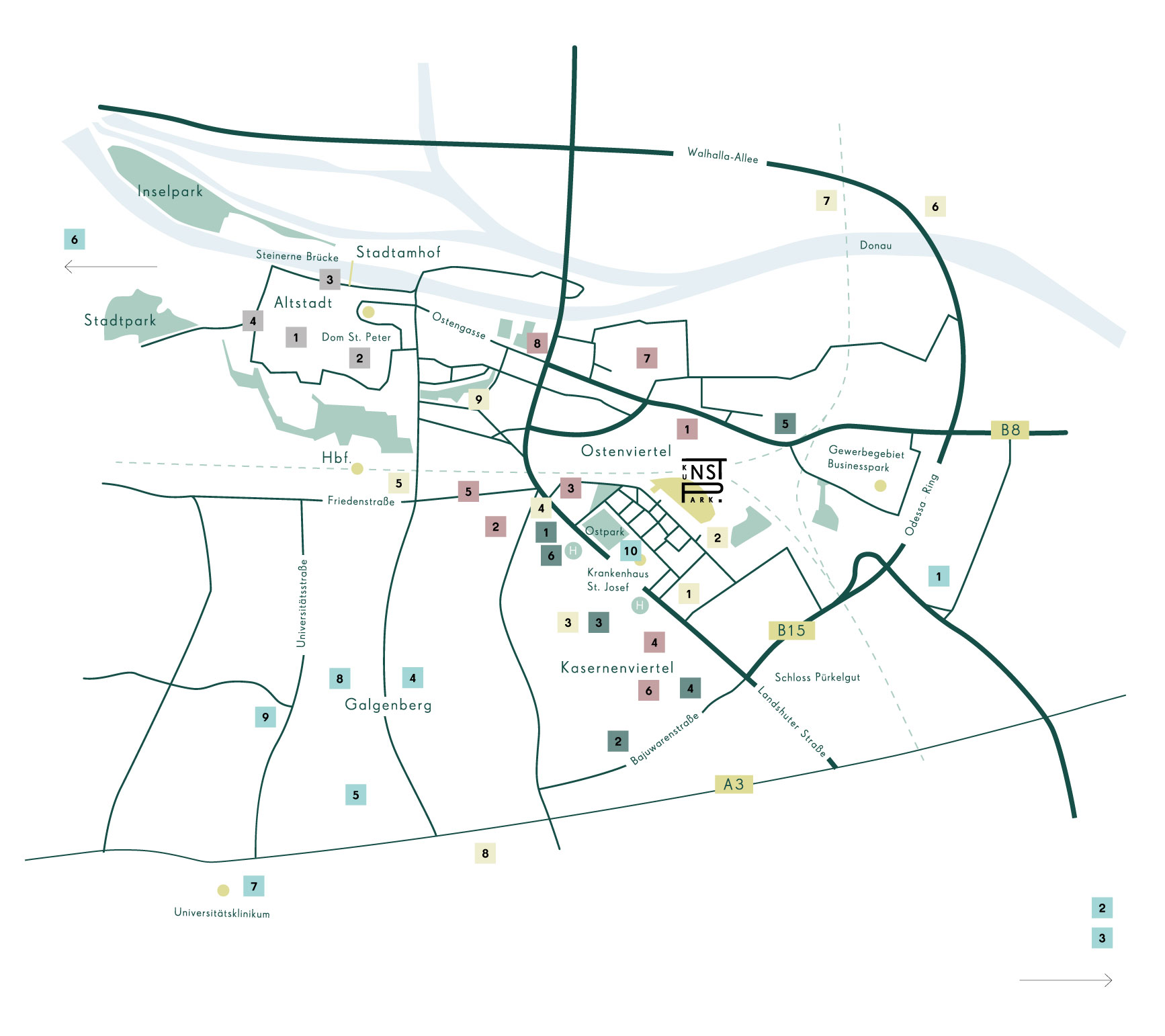 Für die Bewohner sind Stellplätze in den hauseigenen Tiefgaragen oder Parkdecks vorgesehen. Somit sind die PKWs auch vor schlechter Witterung geschützt.