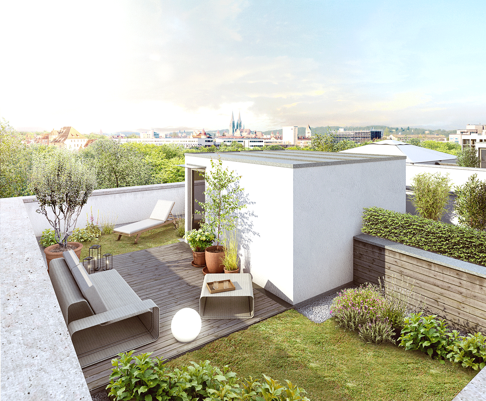 Für Menschen, die das Besondere lieben: Eine Wohnfläche mit bis zu ca. 178 m², konzipiert als Doppelhaus und mit einem eigenen Dachgarten mit Südwest- Blick über Regensburg, beschreibt diese Besonderheit. Das Roof Top House verfügt über bis zu acht Zimmer. Ein Wohnraum und eine großzügige Essküche erstrecken sich über rund 50 m² auf zwei versetzten Ebenen mit direktem Zugang zu Terrasse und Garten. Eine Raumhöhe von bis zu 3,64 Metern macht den Wohnraum zu etwas Besonderem. Fläche ist Luxus: Mitten in der Stadt. Die Architektur – anspruchsvoll und zeitlos.