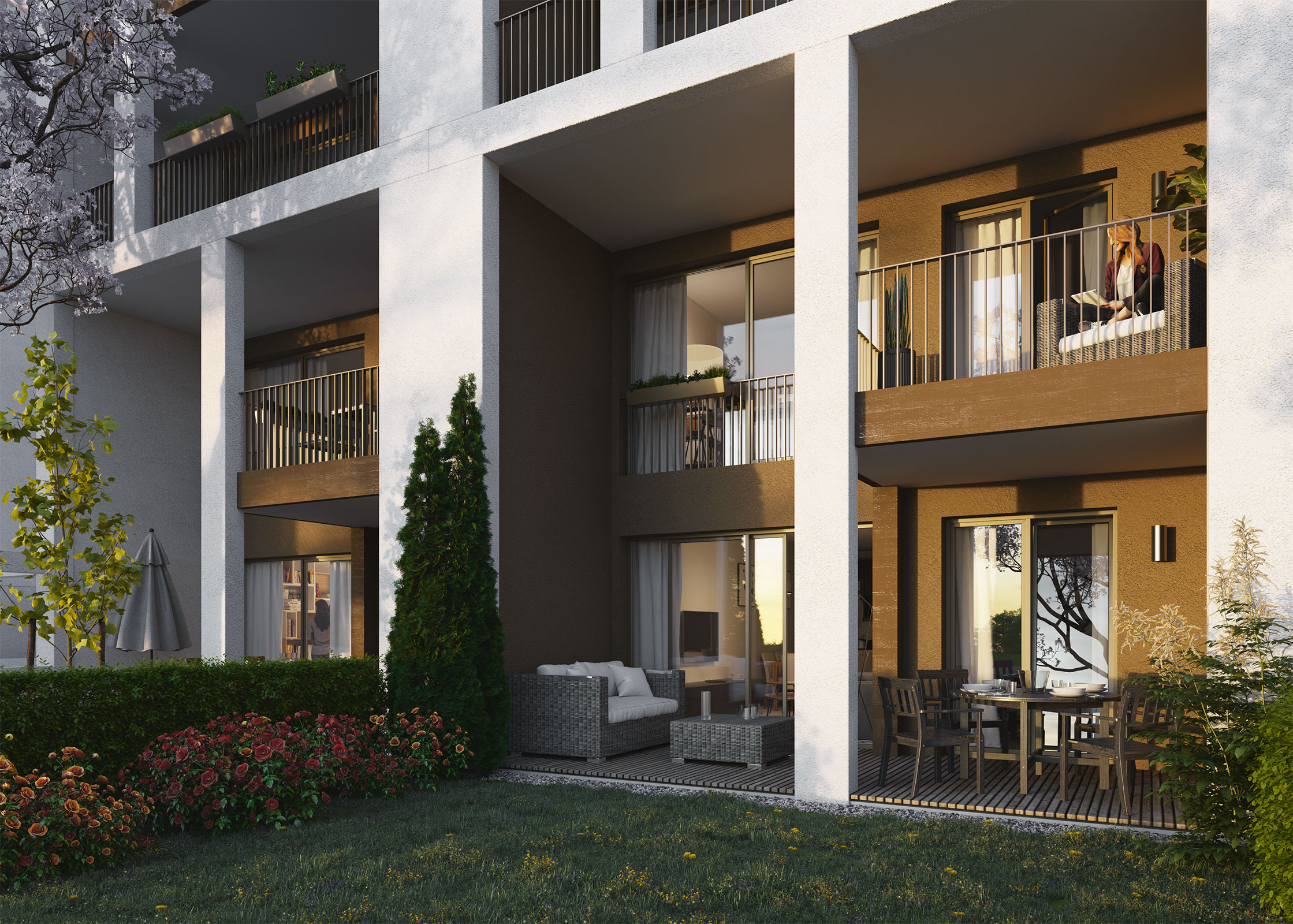 Der zentrale Park und durchgehende Dachbegrünung sowie die umgebenden Grünflächen sorgen für ein angenehmes Mikroklima.