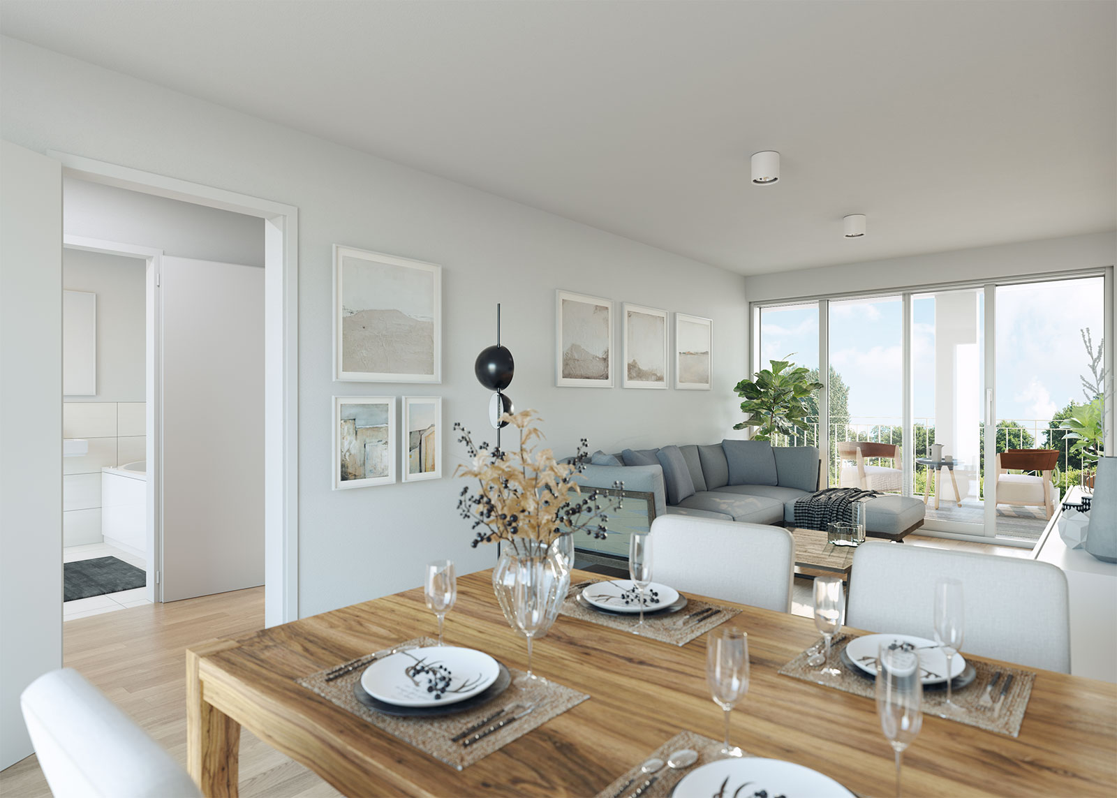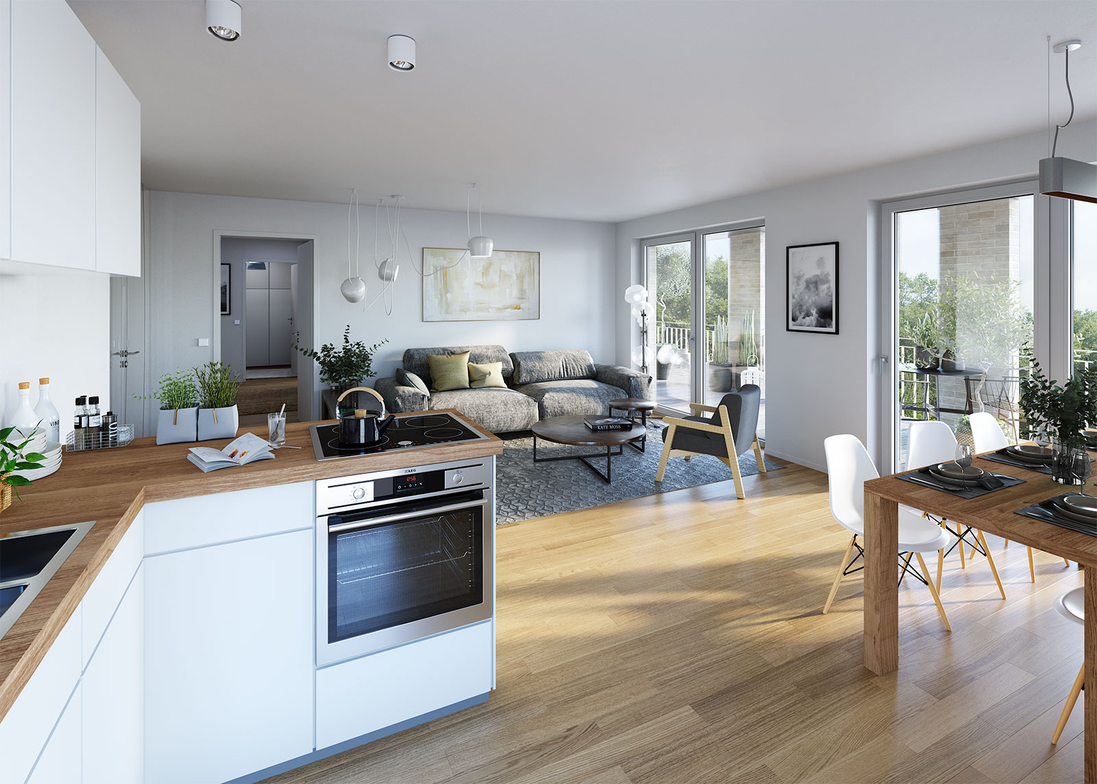 Ein Atelier zeichnet sich durch eine gute Belichtung und lichtdurchflutete Räume aus: Nicht umsonst haben wir unsere bevorzugten Wohnungen Atelierwohnung genannt. Alle Aufenthaltsräume der Wohnungen sind nach Südwesten ausgerichtet. Außerdem verfügen sie über ein modernes Tageslicht-Bad und eine helle Küche sowie eine Panoramaloggia, die Dachterrassenqualität hat: uneinsehbar von allen Aufenthaltsräumen erreichbar, überdacht und großzügig. Ein weiteres Zimmer im Freien! Mit Wohnflächen von 54 bis 65 m² ist für jeden Bedarf gesorgt.